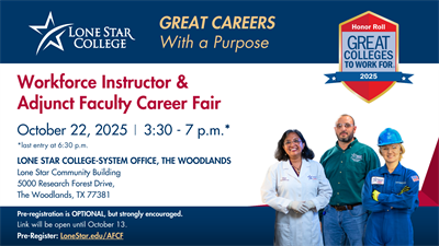 Lone Star College System is recruiting part-time instructors to teach its growing workforce programs across several campuses. Those interested in applying are invited to attend the Workforce Instructor and Adjunct Faculty Career Fair on Oct. 22 from 3:30-7 p.m. at LSC-System Office, The Woodlands, in the Lone Star Community Building, located at 5000 Research Forest Drive, The Woodlands.